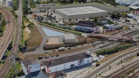 Im Bereich unter der roten Stabbogenbrücke liegen vielfache Fahrspuren nebeneinander; hier sind auch die Tunnel Ein- und Ausfahrten Richtung Südstadt. Alle Fahrbahnen liegen unterhalb des Grundwasserspiegels und müssen als wasserdichte Betonwannen ausgeführt werden. Das führt in diesem beengten Bereich zu 100% Flächenversiegelung. Alles Oberflächenwasser muss gesammelt und in das große Regenwassersammelbecken gepumpt werden, das hinter dem im Bild links erkennbaren Betriebsgebäude (Architektur nicht klar!) liegt.