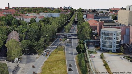 Der stärkste Eingriff wird in dem auf dem Luftbild sichtbaren Bereich zwischen Rothenburger Straße und Landgrabenstraße erfolgen. Der Stadtteil St. Leonhard wird nicht nur während der langen Bauzeit durch die offenen Baugruben für den Tunnelbau, massiven Baulärm und Umleitungen betroffen sein, sondern auch im Ergebnis keine Verbesserung, geschweige denn eine „Stadtreparatur“, erfahren haben. Das Grün im ehemaligen Kanalbecken wird verschwinden, im Austausch gegen viele Fahrspuren.