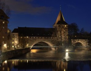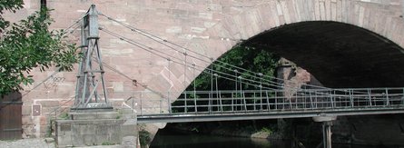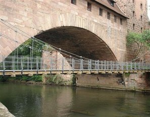 Der Nürnberger Kettensteg - die älteste erhaltene Hängebrücke Kontinentaleuropas - wurde 1824 von Conrad Georg Kuppler als zweifeldrige Fußgängerhängebrücke errichtet. Sie überquert die beiden Pegnitzarme kurz bevor diese die Altstadt verlassen. Der südliche Überbau hat zwischen den beiden Pylonen eine Spannweite von knapp 34 Metern, der nördliche von knapp 33 Metern.