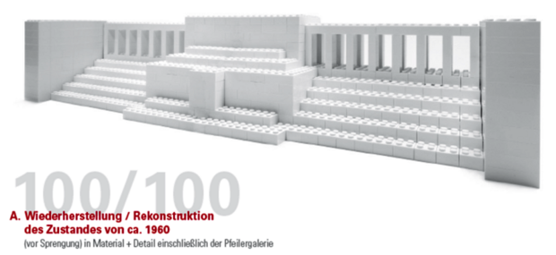 Dazu gehört auch die Wiederherstellung der Kolonnaden. Auch wenn es sich dabei nur um eine reine Schau- und Kulissenarchitektur handelt, wird es nur die vollständige Rekonstruktion der Tribüne Besuchern und künftigen Generationen ermöglichen, dem historischen Schauder begegnen zu können, der mit einer Annäherung und einem möglichen Begreifen der wahnwitzigen und wahnsinnigen Abgründe des NS-Regimes einhergeht. Nur eine 100%-ige Rekonstruktion der zentralen Tribüne in Form und Material kann verdeutlichen, welchen Eindruck die gesamte Anlage einmal gemacht haben muss und zur Erklärung der damit verbunden gewesenen Faszination beitragen.