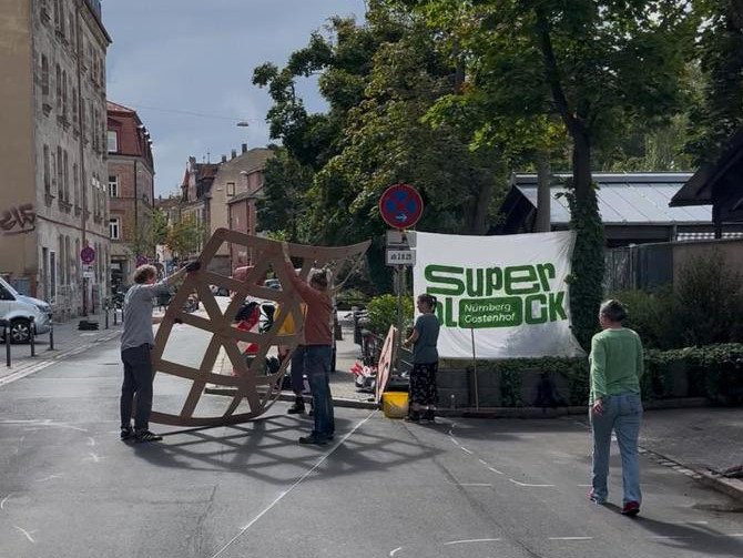 Im Januar 2023 forderte die Initiative „Nürnberg autofrei“ im Rahmen einer Podiumsdiskussion mit Vertretern der Stadtratsfraktionen die Einrichtung von Superblocks nach dem Vorbild Barcelonas. Überraschend folgte ein gemeinsamer Antrag von CSU, SPD, ÖDP und Grünen zur Vorbereitung eines Pilotversuchs. Seit Anfang August werden die Flächen durch Bodenbemalung, Stadtmöbel und Grün belebt. Wir unternehmen einen Spaziergang zu den vier neuen Nachbarschaftsplätzen und berichten vom Entstehungsprozess des Projekts. Dabei wird auch die Verbindung zur Geschichte der Verkehrsberuhigung in Gostenhof hergestellt.