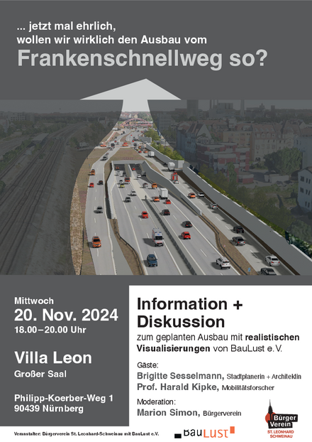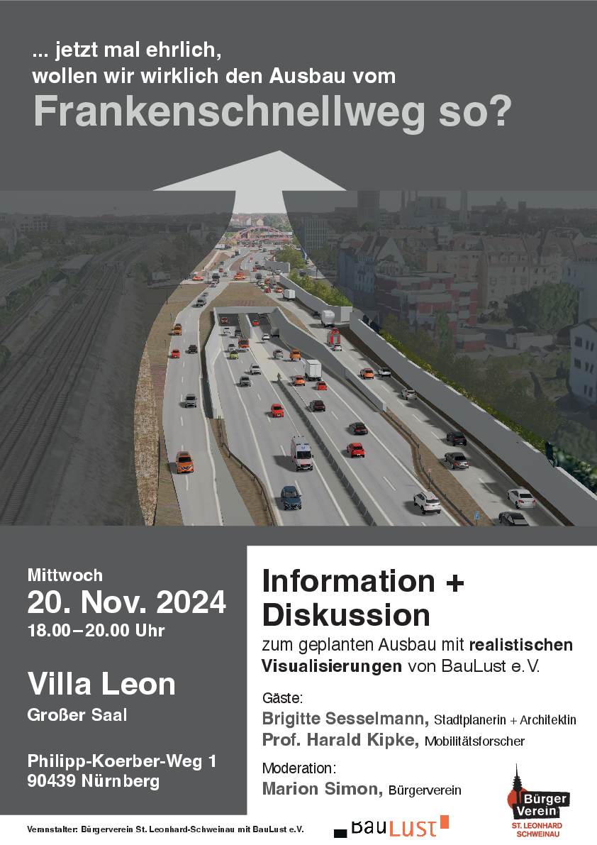 Der Bürgerverein St. Leonhard / Schweinau und BauLust e.V. laden am 20. November 2024, 18:00-20:00 Uhr zu einer Informationsveranstaltung in die Villa Leon ein, bei der Brigitte Sesselmann, Stadtplanerin, die Visualisierungen von BauLust e.V. zeigen und die Planungen erläutern wird und zusammen mit Prof. Harald Kipke, Mobilitätsforscher, für eine Diskussion mit den Bürger*innen zur Verfügung steht.